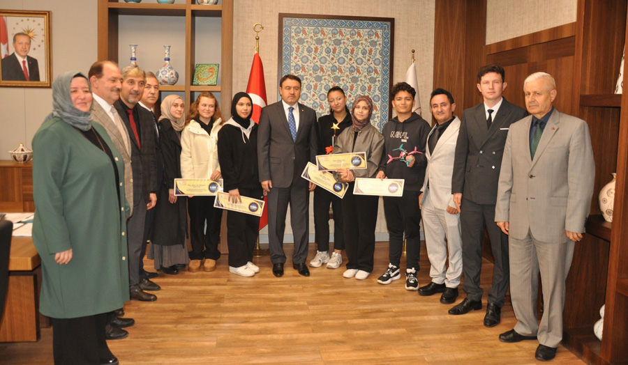 Öğrencileri ve öğretmenleri tebrik eden Vali Işın, Dron Şampiyonu Doruk Cengiz ile Gediz Kız Anadolu İmam Hatip Lisesi öğrencileri Ceylin Bilgili ve Fatma Aymaz ve Kütahya Akşemsettin Kız Anadolu İmam Hatip Lisesi öğrencileri Hüsna Ören, Fatma Işıl Kahraman ve Betül Keler’i para ödülü ile ödüllendirdi.